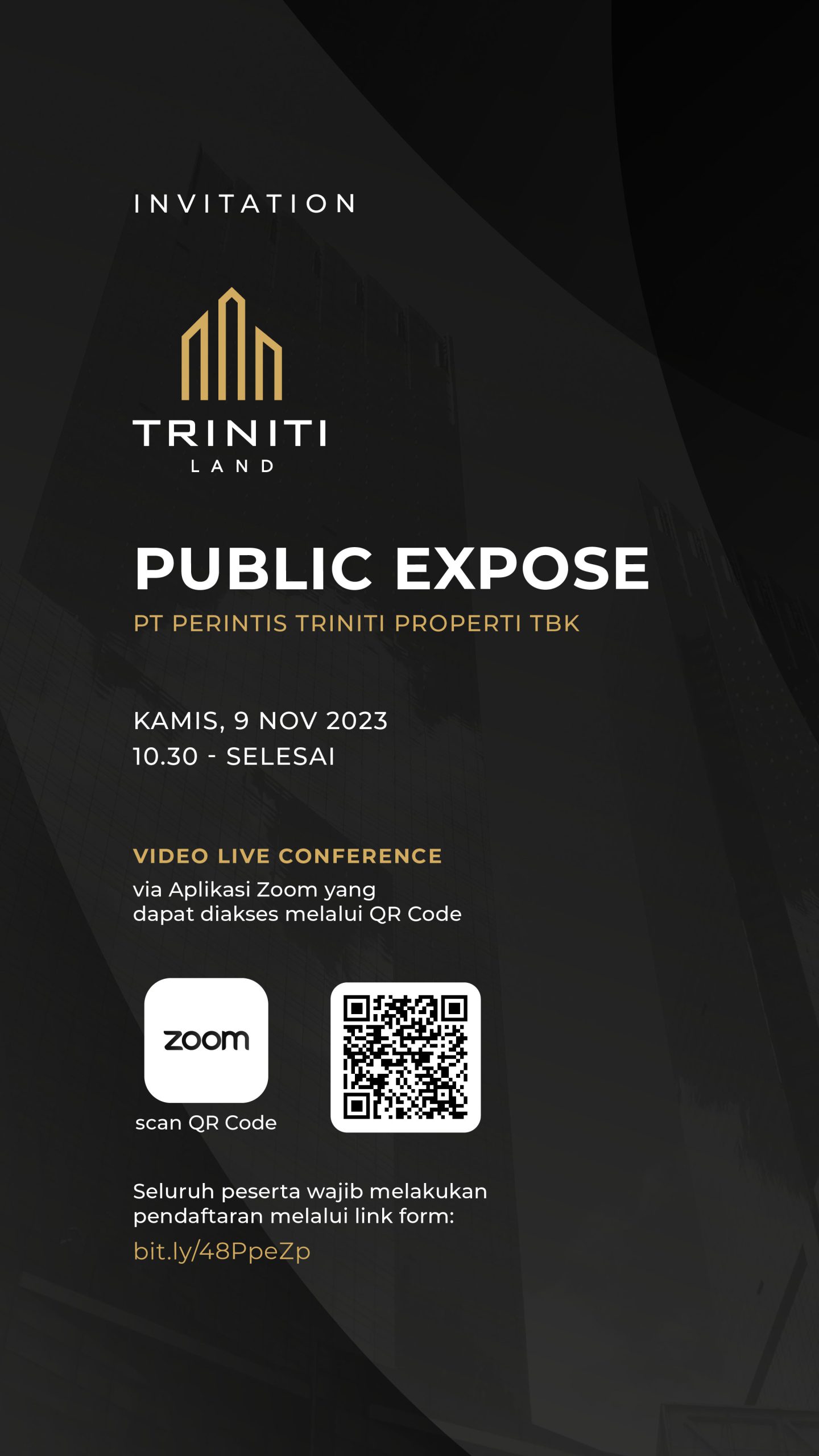 Materi Public Expose akan kami sampaikan ke BEI pada tanggal 6 November 2023. Materi Public Expose akan kami sediakan sejak tanggal tersebut dan dapat diunduh di situs Perseroa pada link berikut: https://trinitiland.comwp-content/uploads/2023/11/PublicExpose-November-2023.pdf